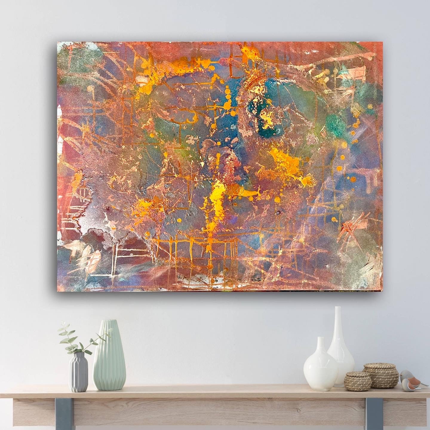 For original canvas art use a white cotton cloth lightly dampened in a gentle soapy water. DO NOT USE HARSH ABRASIVE SOLVENTS.